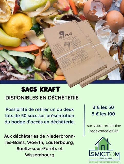 Pour information, les usagers ont maintenant la possibilité de récupérer, sur présentation du badge de déchèterie, un ou deux lots de 50 sacs kraft aux déchèteries de Lauterbourg, Soultz-sous-Forêts, Woerth, Wissembourg et Niederbronn-les-Bains ainsi qu’au siège du SMICTOM à Wissembourg. Ils seront automatiquement facturés sur la prochaine redevance.
